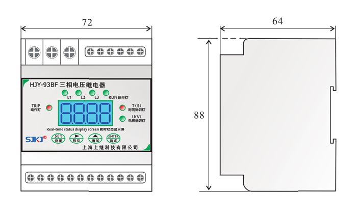 , 無數(shù)值顯示。繼電器達到所設(shè)定值,動作后,由TIRP動作燈會點亮,實際線路電壓低于或高于所設(shè)定的返回值,指示燈切換回來。正常運行情況下,RUN運行燈、電壓設(shè)置表示燈常亮。L1、L2、L3來回切換運行。當輸入電壓任意一相滿足動作條件,繼電器動作,電壓標識燈熄滅,表示延時時間已到動作。當輸入接近動作條件時,繼電器進入動作預備狀態(tài),所有芯片資源用來計算輸入值,一旦滿足條件,立即啟動計時,繼電器設(shè)有啟動量連續(xù)判斷功能和突變量連續(xù)判斷功能,能夠有效迅速的判斷輸入值,并躲過短時干擾。HJY-93BF三相欠電壓繼電器接線圖