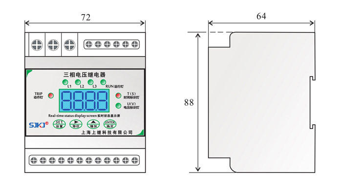 當繼電器2、3端子接入工作電源時,數碼管顯示當前輸入的實時電壓。長按SET設置鍵1秒,便進入L1電壓整定值,可以通過移位鍵和增加鍵設定所需的電壓值,改動的數碼管會閃爍,允許修改。再按一下SET設置鍵,此時時間標識燈點亮,顯示為L1電壓所需的延時值,也通過移位鍵和增加鍵設定所需的時間值。然后再按SET設置鍵,進入設置L2電壓整定值,設定的方法和前面設定一樣及L3電壓同樣如上設置。均設置好后,再按SET設置鍵界面會進入三相電壓各相所需投入使用還是退出。比如只要A、C相工作,B相退出,通過移位鍵將按至B字母位置,按下增加鍵,當數碼管顯示時,說明該相已經退出運行。需要三相均有輸出工作,可以工作增加鍵將相序字母點亮。跳過相序字母顯示頁面,來到過量、欠量方式選擇頁面,可根據自己所需通過增加鍵來設定,0代表欠量(欠壓),1代表過量(過壓)。完全設定好后,可以按ENTER確定鍵快速退出。也可以通過繼電器自動5秒后退出,所設置參數自動保存。退出時顯示實時電壓和所投入的相來回切換數值。若有個別參數設定,可以在設置好后,直接按ENTER確定鍵快讀保存并退出。所需投入的相,指示燈會點亮,會顯示當時實時的電壓數值,未投入的相燈也會燈亮,顯示會是, 無數值顯示。繼電器達到所設定值,動作后,由TIRP動作燈會點亮,實際線路電壓低于或高于所設定的返回值,指示燈切換回來。正常運行情況下,RUN運行燈、電壓設置表示燈常亮。L1、L2、L3來回切換運行。當輸入電壓任意一相滿足動作條件,繼電器動作,電壓標識燈熄滅,表示延時時間已到動作。當輸入接近動作條件時,繼電器進入動作預備狀態,所有芯片資源用來計算輸入值,一旦滿足條件,立即啟動計時,繼電器設有啟動量連續判斷功能和突變量連續判斷功能,能夠有效迅速的判斷輸入值,并躲過短時干擾。