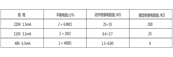 繼電器動(dòng)作值:當(dāng)母線任何一側(cè)對(duì)地絕緣電阻下降到下表值時(shí),繼電器應(yīng)可靠動(dòng)作并有相應(yīng)的動(dòng)作指示。