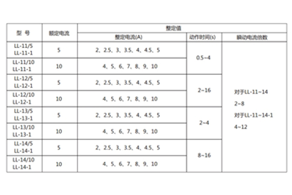 注:特殊規格LL-10-1(11-1、12-1、13-1、14-1)瞬動電流倍數4-12,其余參數與LL-10系列對應;繼電器的電流線圈允許長期通過